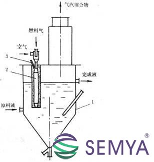前述的各種蒸發(fā)器都是間接加熱的,工業(yè)上有時還采用直接加熱蒸發(fā)器,圖5—7所示的浸沒燃燒蒸發(fā)器就是直接加熱的蒸發(fā)器。將一定比例的燃燒氣與空氣直接噴人溶液中,燃燒氣的溫度可高達(dá)1200~1800℃,由于氣、液間的溫度差大,且氣體對溶液產(chǎn)生強(qiáng)烈的鼓泡作用,使水分迅速蒸發(fā),蒸出的二次蒸汽與煙道氣一同由頂部排出。