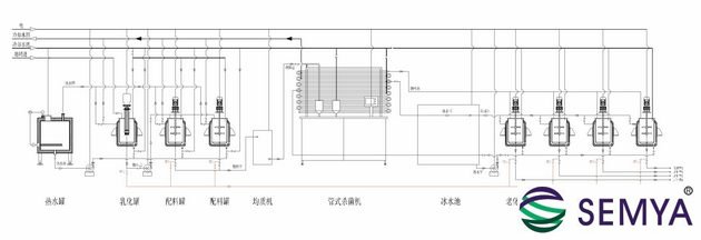 工作原理: 1、生產(chǎn)流程:物料處理系統(tǒng)——板式換熱器——老化缸——冷水機(jī)組——連續(xù)式凝凍機(jī)——冰淇淋灌裝機(jī)。